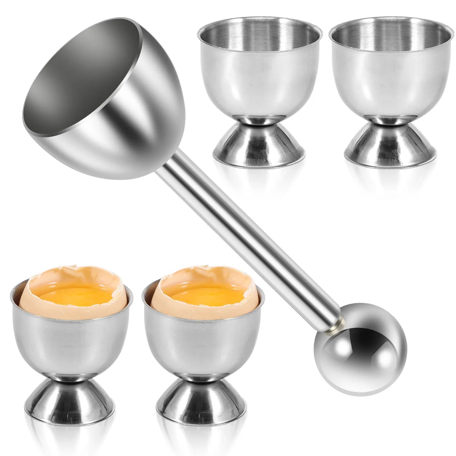 الطقم يشمل أداة قص مصنوعة من ستانلس ستيل عالية الجودة، وأربعة أكواب بيض للعرض أو الاستخدام اليومي — تصميم يخلي مائدة الفطور تبدو أنظف وأجمل.